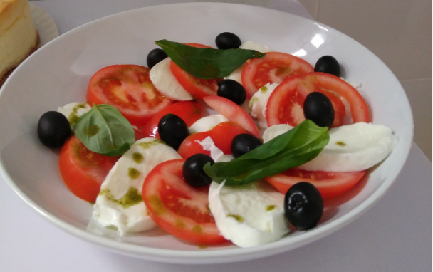 Ensalada Capresse, Mozzarella de búfala, tomates, aceitunas negras y albahaca.