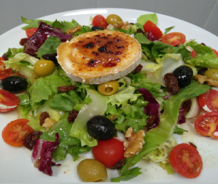 Variedad de lechuga, tomates cherry, aceitunas, pasas, nueces y rulo de cabra.