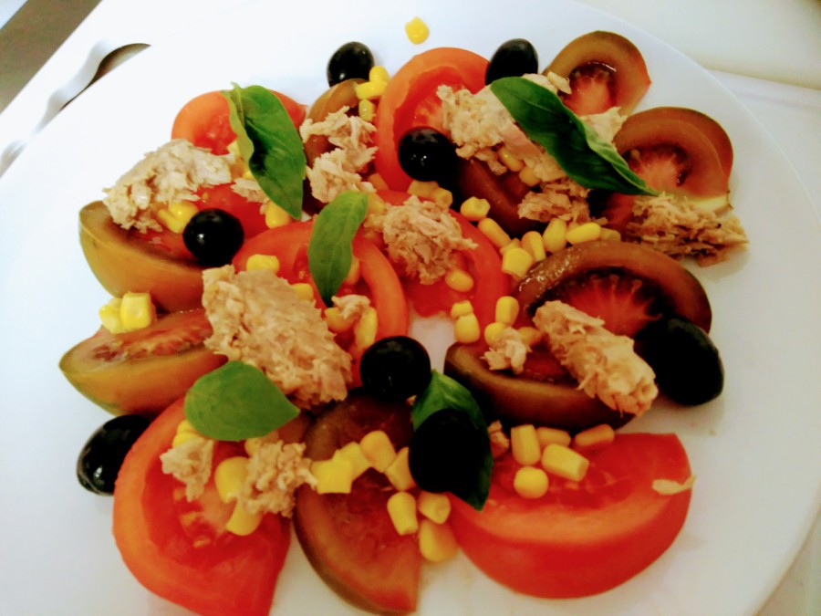Variedad de tomates, atun, maiz, aceitunas y varidad de lechuga.